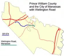 Wellington Road in Manassas forms part of a major connector between eastern Prince William County and Gainesville.[1] The main connecting route between these two communities is the Prince William Parkway with Interstate 66; however, Wellington Road provides a well-traveled backup route.