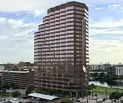 Wells Fargo Center, formerly the Wachovia Center, is a 311-foot (95 m) high rise in Tampa, Florida, U.S.A., anchored by Wells Fargo & Company, Phelps Dunbar and UBS.[3] It was completed in 1985 and has 22 floors. Under new ownership in 2013, the building is undergoing a renovation of the fitness center, parking garage and common areas including the restrooms and corridors. The building received Gold LEED certification in 2010. It was originally known as First Union Plaza until First Union Corporation completed its merger into Wachovia in 1993, then that merged into Wells Fargo in 2008. It is the 13th tallest building in Tampa.[4]