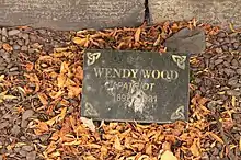Wood remained active into her late-eighties.[10][11] She died in Edinburgh on 30 June 1981, aged 88.[12] A small memorial was placed in Old Calton Cemetery in 2021. It lies near the north parapet wall on Waterloo Place.