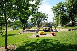 Phase III ran almost concurrently with Phase II, starting in 2008[26] but carrying on into 2009, at a cost of $850,000.[27] This part of the overall project included a new 'tot' playground, improved accessible pathways with lighting, landscaping, inducing tree planting, and restoration of the park's bandshell itself[28] which has been an important landmark in the area for generations.[25] A floating fountain, lit up at night, was placed in the bandshell pond. A new entry arch was created by Cape Breton artist Gordon Kennedy and installed at the intersection of Byng and Bentinck Streets. Kennedy also created artistic stands for interpretive story boards to explain the park's history.[27][2]