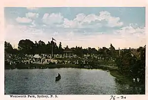 Wentworth Park is a Canadian urban park located in the community of Sydney, part of Nova Scotia's Cape Breton Regional Municipality. The park was created in 1786, just a year after Sydney's founding, making it the oldest of Sydney's parks. Wentworth Park incorporates the Kiwanis Bandshell, a playground, fountains, and a splash pad, as well as a 1.2 kilometres (0.75 mi) network of paved paths surrounding the park's ponds and flower beds.