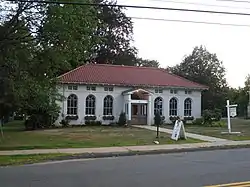 Farmington's former West End Library is located in the center of Unionville village, on the south side of School Street west of Connecticut Route 177. It is a single-story building, with load-bearing brick walls finished in stucco, and a red tile roof. Its main facade is seven bays wide, with a projecting gable-roofed entry portico in the center bay. The other bays have tall round-arch windows, with small rectangular transom-like windows set above, just below the roofline, with diamond grillwork.[3]