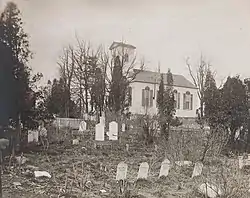 In 1814 The First Presbyterian Church of West Farms (also known as the West Farms Presbyterian Church) was formed. The Lawrence family donated a 295 ft × 100 ft (90 m × 30 m) lot (which included the burial ground) to the new church, retaining burial rights for the Lawrence family.[3] At the same time, the church acquired a 80-by-175-foot (24 m × 53 m) parcel opposite the Lawrence property on the north side of Samuel Street. A church with a surrounding graveyard was built atop a hill on the north parcel the next year.[4]
