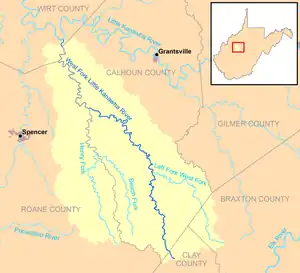 The West Fork Little Kanawha River is a tributary of the Little Kanawha River, 48.1 miles (77.4 km) long,[3] in west-central West Virginia in the United States. Via the Little Kanawha and Ohio rivers, it is part of the watershed of the Mississippi River, draining an area of 246 square miles (640 km2)[4] in a rural region on the unglaciated portion of the Allegheny Plateau. By drainage area, it is the second-largest tributary of the Little Kanawha River, after the Hughes River.[4]