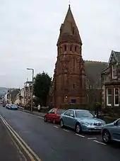 St. Andrew's church, formerly known as St. Brides, belongs to the Church of Scotland. It has a large rose stained glass window and a tall, gothic bell tower.