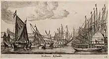 The Nieuwe Waal was deepened in the IJ in 1610 and demarcated with rows of poles as an extension of the Port of Amsterdam. This left an area of almost floating or loose peat in the corner of the IJ, which needed to be stabilized. Between 1611 and 1615 three large artificial islands were created there, protected by a large bulwark that extended as far as the IJ. This was part of the Third Expansion - Derde Uitleg (nl) - of Amsterdam, for which the first plans date from 1610.[2] Land speculation by a number of council members, including Frans Hendricksz. Oetgens, led to a riot in the council in 1614. If the speculators had got their way it would have led to the need for extensive buy-out of land by the city, or a reduction in income to the city.
