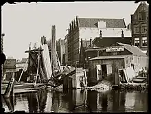 Reynier Reael gave credit to ship carpenters, who did not have to pay rent for the first twelve years, but had to deliver a ship. His heirs had houses built on the island, which the city opposed.[9] The tar company of Joseph Deutz got a large yard on the Realen Island in 1664.[10] Until 1673 there was also a peat market. The Dutch West India Company owned a ropery which was sold in 1650. The city owned carpentry yard. As early as 1676 there was a brandy distillery at the Drieharingenbrug, called De drie gecroonde haringen (The three crowned herrings). These business premises were demolished around 1780 by shipbuilder Haring Booy and rebuilt as a sort of country house.[11] For many years, the tobacco firm British American Tobacco was established on Realeneiland. The island became known through the books of Jan Mens about the Golden Reael.