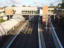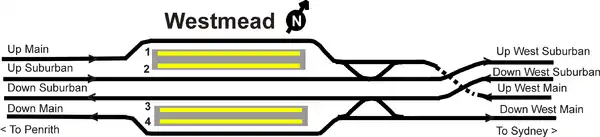 Westmead station opened in March 1883.[2] To the east of the station lies a dive through which one of the eastbound tracks passes. This was opened in 1986 as part of the quadruplication of the Main Western line between Westmead and Granville. It was necessary because west of Westmead the two westbound tracks run adjacent to one another as do the two eastbound tracks. East of Westmead, the lines are configured to run as West/East/West/East.[3]