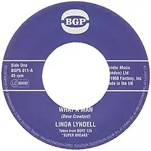 Linda Lyndell, a white singer who had been a supporting act with James Brown and Ike & Tina Turner and then recommended to Stax Records by Otis Redding, recorded "What a Man".[1] The song was essentially improvised by Lyndell, record producer Dave Crawford, and the Stax studio musicians in Memphis, Tennessee. It was released as a single in 1968 with the B-side track "I Don't Know"; both songs were credited to and produced by Dave Crawford.[2] The single entered the Billboard Hot Rhythm & Blues Singles chart on August 24, 1968, and then peaked at number 50.[3] The record came to the attention of white supremacists in the Ku Klux Klan, who threatened Lyndell for associating with black musicians; as a result, she largely withdrew from the music business for the next 25 years.[1]