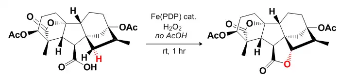 The above figure shows a carboxylic acid directed diastereoselective lactonization of tetrahydrogibberellic acid via a C-H oxidation to form a butyrolactone derivative.[5]