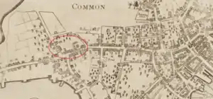 Prior to 1700, the White Horse was owned by the William Colburn (aka William Colburne) family.[4] Under the ownership of Thomas Brattle (1700-ca.1740), the tavern was managed by Thomas Chamberlain (licensed in 1717), and William Cleeres (licensed in 1718). After Brattle, the tavern was owned by Jonathan Dwight (1740-ca.1765?). Managers included Mrs. Moulton (licensed in 1764). The next owner was Joseph Morton (1765–1791). In May, 1787, Israel Hatch of Attleboro took over as manager of the tavern.[5] Subsequent owners included Joseph Morton's son, Perez Morton (1791-1799); and Aaron Emmes (1799[6]).[7]