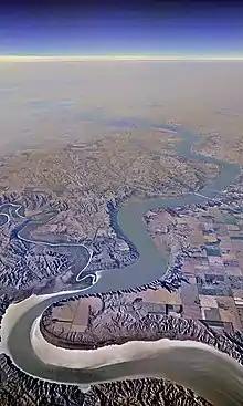The White River is a Missouri River tributary that flows 580 miles (930 km)[3] through the U.S. states of Nebraska and South Dakota. The name stems from the water's white-gray color, a function of eroded sand, clay, and volcanic ash carried by the river[5] from its source near the Badlands.[6] Draining a basin of about 10,200 square miles (26,000 km2),[4] about 8,500 square miles (22,000 km2) of which is in South Dakota,[7] the stream flows through a region of sparsely populated hills, plateaus, and badlands.[8]