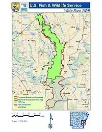 The White River National Wildlife Refuge (officially Dale Bumpers White River National Wildlife Refuge) is a 160,756 acres (650.56 km2) wildlife refuge located in Desha, Monroe, Phillips, and Arkansas counties in the U.S. state of Arkansas. The refuge is managed by the United States Fish and Wildlife Service. White River NWR borders on Cache River National Wildlife Refuge at its northern boundary. In 1974, the White River Sugarberry Natural Area was designated as a National Natural Landmark by the National Park Service.[3]