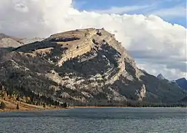 The mountain is composed of sedimentary rock that was laid down up to 450 million years ago in an ancient sea. The uppermost stratum is 300 million-year-old Madison Limestone, where seashell fossils are common. The cliff-forming limestone overlays a broken band of Darby Formation, which in turn overlays cliff-forming Bighorn Dolomite.[2] The once sea-level strata were uplifted during the Laramide orogeny. Obsidian chippings have been found near the summit, suggesting the first ascent was possibly made by Native Americans.[5]