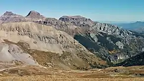 Whitehouse Mountain is a 13,492-foot-elevation (4,112-meter) mountain summit located in Ouray County of southwest Colorado, United States.[4][5] It is situated four miles west of the community of Ouray, on land managed by Uncompahgre National Forest. It is part of the Sneffels Range which is a subset of the San Juan Mountains, which in turn is part of the Rocky Mountains. It is west of the Continental Divide, 2.2 miles north of Potosi Peak, and 3.2 miles east-northeast of Mount Sneffels. Topographic relief is significant as the east aspect rises 5,680 feet (1,730 meters) above the town of Ouray in approximately four miles. The mountain's name, which has been officially adopted by the United States Board on Geographic Names, was in use before 1906 when Henry Gannett published it in the Gazetteer of Colorado.[6]