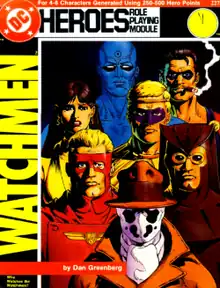 Mayfair Games published the superhero role-playing game DC Heroes in 1985 under license from DC Comics. Who Watches the Watchmen?, published in 1987 as a 32-page softcover book, was written by Dan Greenberg, with cartography by Jerry O'Malley and Ike Scott, and cover art by John Higgins (color), and Dave Gibbons (sketch, pencils and inks), who also did the interior illustrations.[2]