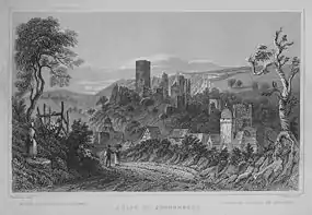 The first written mention of Sonnenberg dates from 1208 or 1209 in the name of the first Burgmann ("castellan") Ulbert of Idstein-Sonnenberg as Sonnenburch and Sunnenberc. It was first called Sonnenberc in 1221. Ownership of the land was initially disputed by the Saint Martin's Domstift (cathedral endowment) of Mainz. This dependence to Mainz had been generally unfavorable to Sonnenberg a long time, because four Archbishops of Mainz in the 13th century alone were from Eppstein, the enemies of Nassau. The dispute over Sonnenberg was settled by a treaty in 1221, in which Nassau obtained the land on which the castle is built as a fief for 30 Marks.[2] Sonnenberg Castle was one of nine castles ruled by the House of Nassau.