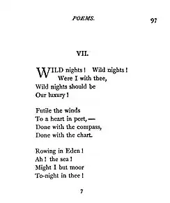"Wild Nights – Wild Nights!" is an 1861 poem by Emily Dickinson.[1] It was included in her posthumous collection of Poems, Second Series, published November 9, 1891.[2]