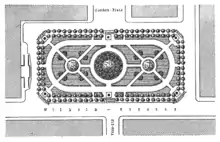 In 1826, Schinkel submitted his suggestion to move the position of the Leopold I Memorial as a part of the largest yet transfiguration of the square under his supervision. The other statues were also allocated new locations along the diagonals and lateral axes of the square. Besides these changes, he graced the surface of the square with greenery, a lawn dotted with lime trees and encircled by an oval walking path, which traced the borders of the square. Altogether, the new upgrades gave the space the appearance of a park.[19]