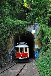 The railroad offers passenger excursions using a historic or replica-historic trolley on a former Southern Pacific line previously known as the Jefferson Street branch. The line runs for 5.5 miles (9 km), including a passage through the 0.25-mile-long (0.4 km) Elk Rock Tunnel. The Lake Oswego terminal is downtown, alongside State Street (Oregon Route 43) just south of A Avenue. The location of the Portland terminal has varied over the years, but since fall 2003 it has been at SW Bancroft Street and Moody Avenue in the new high-density South Waterfront neighborhood under construction, a location that was only one block south of the Portland Streetcar terminus at SW Lowell Street and Moody Avenue after the latter's extension in 2007. However, all service on the Willamette Shore line was suspended in July 2010, when the line's only streetcar broke down.[2] In early 2013, a lease was secured on a replacement streetcar, a Gomaco-built faux-Vintage Trolley, to enable a resumption of service on the southernmost portion of the line,[3] and that section of the line reopened in August 2014.[4] Service over the northern half of the line, to Bancroft Street in Portland, was restored on July 21, 2017.[5]