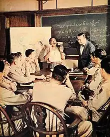![]() Cornyn and Maung Shwe Waing teaching Burmese to officers from OSS Detachment 101. | |