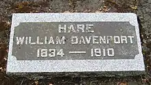 In 1859, William D. Hare married Henrietta Scholfield, and they had six children—Joseph C. Hare, Frances Ellen Hare, Martha G. Hare, Henrietta Hare, Ruth Hare, and William G. Hare who also served in the legislature.[1][8] Scholfield, who died in 1890, was the sister of Illinois Supreme Court Justice John Scholfield.[9] After her death, Hare's second marriage was to Mary A. Anthony in 1893, and she died in 1908.[1][9] She was a cousin of Susan B. Anthony.[9] He was a member of the Masonic Order and the Ancient Order of United Workmen.[2] As a Mason, he was selected as Grand Master of the Oregon chapter in 1871.[9] William Davenport Hare died in his home in Hillsboro on February 6, 1910, at the age of 75 and was buried at the Hillsboro Pioneer Cemetery.[2][9][10]