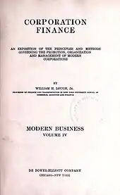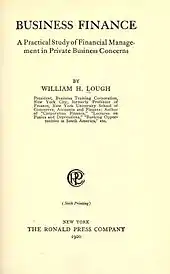 A 1918 review of this work by Arthur S. Dewing (1880–1971)[17] stated, that this book represents an important study of modern financial practice, especially with reference to medium-sized industrial corporations. More than the majority of books on corporation finance heretofore published, it seeks to discover what might be called a financial "ought", which differentiates between good and bad financial policies. Everyone knows the fundamental difficulty which brought about the receiverships of the Atchison or the Westinghouse companies. These are stock illustrations. But Lough's insistence that the private corporation should prepare a budget is, in the reviewer's opinion, a new and important contribution.[18]