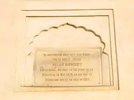 Moorcroft was born in Ormskirk, Lancashire, the illegitimate son of Ann Moorcroft, daughter of a local farmer.[1] He was baptised in 1767 in St Peter & St Paul, the Parish Church of Ormskirk, where there is a commemorative plaque to his life. His family had sufficient means to secure an apprenticeship with a surgeon in Liverpool but during this time an unknown disease decimated cattle herds in Lancashire and young William was recruited to treat stricken animals. His proficiency so impressed the county landowners they offered to underwrite his education if he would abandon surgery to attend a veterinarian college in Lyon, France. He arrived in France in the revolutionary year of 1789 and became the first Englishman to qualify as a veterinary surgeon. On completing his course he began practice in London, established a "hospital for horses" on Oxford Street, helped found the first British veterinary college, proposed new surgical methods for curing lameness in horses, and acquired four patents on machines to manufacture horseshoes.[1] In 1795, Moorcroft published a pamphlet of directions for the medical treatment of horses, with special reference to India, and in 1800 a Cursory Account of the Methods of Shoeing Horses.[2]