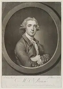William O'Brien was probably born in County Clare in about 1740 to a family which claimed a distant connection to the Viscounts Clare. His father was a fencing master in Dublin[1] David Garrick brought O'Brien over to London from Dublin in 1758 to join his actor's company at Drury Lane. O'Brien was successful in a number of roles, particularly Shakespeare and contemporary comedies.[2] He eloped with Lady Susannah "Susan" Fox-Strangways, eldest daughter of Stephen Fox, the first Earl of Ilchester, whom he had met when they both performed in amateur theatricals at Holland House.[3] Their marriage, which took place on 7 April 1764 at St. Paul's Church, Covent Gardens, was disapproved of by Lady Susan's family.