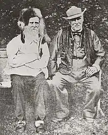 Soon returning to Wales, Price set himself up as a Druid, founding a religious Druidic group that attracted a number of followers. Little is known of the specific doctrines which he preached, but his followers walked around carrying staffs engraved with figures and letters. Declaring that marriage was wrong as it enslaved women, he began having a relationship with a woman named Ann Morgan, whom he moved in with, and in 1842 they had a daughter. He baptised this child himself at the Rocking Stone in Pontypridd, naming her Gwenhiolan Iarlles Morganwg (meaning 'Gwenhiolan, Countess of Glamorgan').[26] He began developing an appearance that was unconventional at the time, for instance wearing a fox fur hat (signifying his healing powers as a doctor) and emerald green clothing, as well as growing his beard long and not cutting his hair. He also began attempting to hold Druidic events, organising an eisteddfod at Pontypridd in 1844, but nobody turned up, and so, solitarily, he initiated his daughter as a bard at the event. In 1855 he then led a parade of the Ivorites, a friendly society that held to a philosophy of Welsh nationalism, through the streets of Merthyr Tydfil, accompanied by a half-naked man calling himself Myrddin (the Welsh name for Merlin) and a goat.[27]