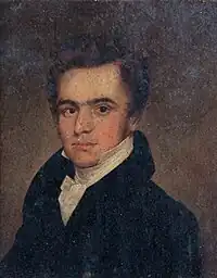 William Price was born in a cottage at the farm Ty'n-y-coedcae ("the smallholding of the hedged field, tyddyn + y + coetgae") near Rudry near Caerphilly in Glamorganshire on 4 March 1800.[6] His father, also named William Price (b. 1761), was an ordained priest of the Church of England who had studied at Jesus College, Oxford. It is believed that he was a descendent of Ellis Price, the grandchild of Rhys Fawr ap Maredudd, a Welsh nobleman chiefly known for his valour at the Battle of Bosworth Field in 1485, where he fought on the side of Henry VII.[7][8] His mother, Mary Edmunds (1767–1844), was an uneducated Welshwoman who had worked as a maidservant for his paternal grandmother prior to his parents' marriage. Their marital union was controversial because Mary was of a lower social standing than William, something which was socially taboo in late 18th-century British society. They married at Machen church. In a South Wales Star article in 27 January 1893, children of the congregation recalled that after the procession, William's father (who was full of glee) ran onto the road dancing and pointing her out, shouted: "Dwi wedi ei ddwyn hi!, edrychwch!, edrychwch!" ("I have taken her, look!, look!.") .[8] The couple had three other surviving children, Elisabeth (1793–1872), Mary (1797–1869) and Ann (1804–1878).[9]