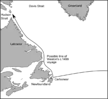 It is not certain that Weston accompanied Cabot on his expeditions, but it seems probable as his own expedition was probably related to Cabot's assigning patent rights to him for exploration in 1499. Moreover, in January 1498 Cabot and Weston received rewards from King Henry VII, following a royal audience. This suggests the two were working together by this time, with Weston probably being one of the 'great seamen' and Bristol 'companions' of the Venetian explorer, discussed in a diplomatic correspondence of December 1497.[8] In a letter to the Duke of Milan, the Milanese ambassador noted that some of Cabot's Bristol companions on his recent voyages had accompanied the Venetian to Court and had testified to the truth of the explorer's claims about the lands [North America] he had discovered in the summer of 1497.[9]