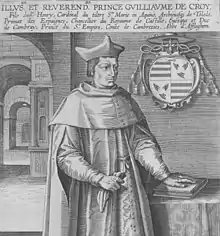 Cardinal Guillaume, Guillermo or William de Croÿ (1497 – 6 January 1521), a member of the noble House of Croÿ, was Prince-Bishop of Cambrai from 1516 to 1519 and Archbishop of Toledo from 1517 to 1521. He was born in the Habsburg Netherlands and died in Worms, Germany.