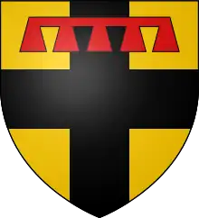 During the lifetime of his brother, John, William bore arms blazoned: Or, a cross Sable, debruised by a label of five points Gules. Upon succeeding John, William bore arms blazoned Or, a cross Sable. These arms were later inherited by his illegitimate son, William.[2]