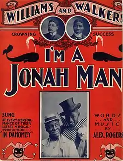 - ↑ Rogers, Alex (1903-01-01), "I'm a Jonah Man" from the musical "In Dahomey". 1903 sheet music cover. Bert Williams and George Walker, vaudeville stars "Williams & Walker", shown on cover in both formal portraits and in stage costumes with blackface., retrieved 2016-10-03