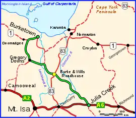 The Wills Developmental Road is a road in north-west Queensland running between Julia Creek and Burketown.[1] As of 2016 it is sealed with a total length of 500 kilometres (310 mi). There are no major towns along the entire route, but fuel and supplies are available at the Burke and Wills Roadhouse at Four Ways, and also at Gregory. The Wills Developmental Road joins the Burke Developmental Road for approximately 1.2 kilometres, avoiding a direct crossroads at their intersection. Two major rivers are crossed by the Wills Developmental Road en route, the Cloncurry and the Leichhardt.[2]