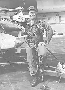 ![]() Lieutenant Commander Wilmer P. Cook poses with his Douglas A-4 Skyhawk | |
