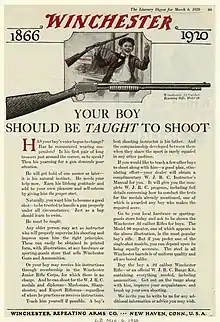 The Winchester Model 1906 was designed as a more inexpensive companion to the popular Model 1890, the main differences being the 1906's flat shotgun-style butt plate and rounded barrel, as opposed to the 1890s crescent butt plate and octagon barrel. When the Model 1906 first became available, it was chambered exclusively for the .22 Short cartridge, however, this was modified after serial number 113,000 (in the second year of production, 1908) when it was made to also cycle .22 Long and .22 Long Rifle interchangeably in order to ensure the rifle's continued popularity.[2] There were three different variants produced by Winchester; the .22 Short Model, the Standard Model, and the Expert Model.[3] The .22 Short Model was made until 1908 when the caliber modification came about. It was distinguishable by its flat, plain slide grip. The Standard Model was introduced after the 1908 change, and featured a grooved slide grip, while the Expert Model, the deluxe version produced from 1918 to 1924, had a plain fluted slide grip and a pistol-gripped stock. The Expert Model was a favorite of Theodore Roosevelt's children and cousins.[4] Although production ended officially in 1932, a small number of Model 1906 rifles were built out of spare parts left in the factory until 1936. The last known serial number is 847,997, which does not match the number of rifles sold. This is attributed to the fact that large blocks of serial numbers were skipped during production.[5]