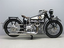 The factory was located at Bülowstrasse 106, Berlin W57, under the direction of factory owner Hans Windhoff. Windhoff initially produced radiators for cars, trucks, and aircraft, setting up a factory with his brother Fritz in Rheine in 1902, then on his own in Berlin from 1907-24.[2] In 1924, he entered the burgeoning German motorcycle market with a water-cooled two-stroke of 125cc. The engine was built under license from a design by Hugo Ruppe, whose ladepumpe (an extra piston used as a supercharger to compress the fuel/air mix) design was used most successfully by DKW in their Grand Prix racers. Windhoff had much racing success with these small two-strokes, although an experiment with enlarged two-stroke racers of 493cc and 517cc were less reliable.[3]