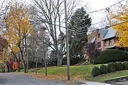 Windsor Road extends northward from the center of Waban village, and turns west before ending at a dead end adjacent to the country club. Kent and Hereford are spur roads between Windsor Road and the country club. The district is 26 acres (11 ha) in size, and includes a total of 48 residences on large landscaped lots. Several of these houses were designed by architects, including Strong's own house at 48 Windsor Road, built in 1896 to design by H. Langford Warren, and 102 Windsor, also designed by Warren. Both of these houses are Queen Anne in style, with Shingle overtones. The Colonial Revival is well-represented in the district, with fine examples at 55 Windsor (1897) and 63 Windsor (1903). There are also fairly early examples of Tudor Revival houses at 92 Windsor and 210 Kent Road. The district has only four houses that were built after 1950; none of them contribute to its historic significance.[2]