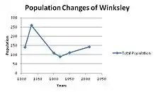 As Winksley is a small parish in North Yorkshire therefore it has a relatively small population density of 142 people.[1] There are 119 persons over the age of 16,[3] the largest age group is adults aged between 35 and 54[3] indicating that Winksley is a quiet and more family orientated area. The two next largest age groups are 55–64 with 24 people and 65–74 with 22 people[3] illustrating this is a place where many people like to retire. The population has not changed over the past two centuries, in 1811 the population was 143 persons,[4] showing that Winksley is still at present a rural and relatively isolated area in North Yorkshire. The number of females and males is still unchanged with a slightly higher female population of 74 in both 1811 and 2011,[4] the male population of Winksley has decreased by one from 69 in 1811 to 68 males in 2011.[4] Even though the population in the early 1800s and the current population are extremely similar, during the mid 19th century there was a significant increase in Winksley's population. According to the historical population reports of England, in 1821 the population increased to 176 persons and by 1831 the population rocketed to 259 persons, in total Winksley's population increased by 116 people over 20 years.[5] 1831 was the beginning of the industrial revolution; in the towns and cities that surrounded Winksley there would have been an increase in work for young men. But there was still agricultural work in Winksley although the number of people working in agriculture decreased from 18 in 1811 to 10 in 1831.[5]