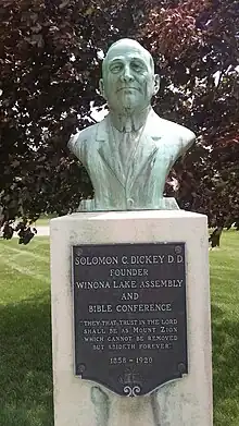 The grounds changed ownership in 1894 when The Presbyterian Church of Indiana purchased the land, a transaction that was negotiated by Solomon C. Dickey. Dickey was then serving as the superintendent of Home Missions for the Indiana synod and would become an honored figure in Winona Lake.[4] Dickey changed the name of the lake and established the Winona Assembly and Summer School in 1895. Although Chautauqua sites often included religious elements, Dickey was intent on bringing a stronger religious feel to the Winona programs and Bible conferences were begun immediately in 1896. Several notable persons held the position of president of the "Assembly," including H. J. Heinz and John Studebaker. Well known evangelists including J. Wilbur Chapman and William Biederwolf served as heads of the Bible conferences. Many performers and lecturers included Winona Lake in their Chautauqua "circuits," including Benjamin Harrison, William Jennings Bryan, Admiral Richard Byrd, Glenn Curtiss, Helen Keller, Will Rogers, James Whitcomb Riley, and Jane Addams among others. In 1911, the sensational evangelist Billy Sunday moved his family to Winona Lake, building an Arts and Crafts bungalow that has been preserved as the Billy Sunday Home Museum. Sunday's song leader, Homer Rodeheaver, soon relocated to Winona Lake as well. Numerous small summer schools were also established.[5]