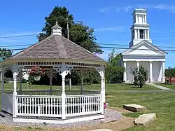 The historic district is bounded on the east by the Still River, and the north by Holabird Avenue, just north of the northern tip of the green. There are 77 historically significant buildings in the 28-acre (11 ha) district, not including the bandstand on the green, which was built in 1970. One of the most imposing houses is the 1844 Greek Revival house of lawyer Gideon Hall, Jr.; it features a two-story Doric Greek temple portico. The northern end of the green is visually anchored by the Romanesque First Congregational church, built in 1903.[2]