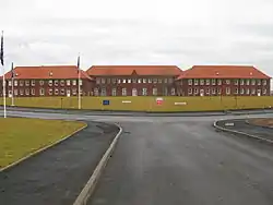 Winston Barracks was built between 1939 and 1941 to accommodate the Depot of the Cameronians (Scottish Rifles), whose previous depot at Hamilton Barracks was becoming inadequate.[1] The buildings were designed to "embody all the latest devices of permanent construction"[2] and the cost was estimated to be in the region of £150,000. The buildings were mainly in Neo-Georgian style, the most prominent being the main H-shaped barrack block on the north side of the parade ground. Most of the buildings were completed in 1939 with completion of the complex in 1940, as attested by the dates on the rain water hoppers found high on the south elevation of the main barrack block. The site occupied a total of 55 acres (22 ha) and incorporated barrack blocks, officers' quarters, non-commissioned officers' quarters, stores, boiler houses, medical block, gymnasium, assault course, and firing and rifle ranges.[3] In 1939, with the Regiment about to move to its new accommodation, the Second World War broke out.[1]