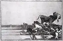 This can be seen in both The Dog from the same series, and his print Unfortunate events in the front seats of the ring of Madrid, and the death of the Mayor of Torrejón, where he left large empty areas. This seems to have been a reaction against contemporary conventions of balance and harmony,[44] and was a precursor to works by modern artists such as Francis Bacon, who greatly admired Goya's depiction of what Bacon described as "the void".[45]