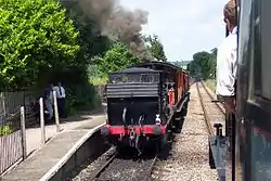 Between February 1941 and August 1944, a rail-mounted howitzer named SM Cleeve, belonging to the No. 4 (Suffolk) Super-Heavy Railway Battery RA, was stationed at Wittersham Road. Weighing 86 tonnes (85 long tons; 95 short tons) and capable of firing 9.2 inches (230 mm) shells, it was only fired once, causing all the windows in the station to break.[8] Three GWR Dean Goods Class locomotives were on hand to move the howitzer.[9]