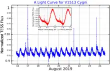 Wolf 1130AB is a periodic variable star with a period of 0.497 days and also a flare star, with the variable star designation V1513 Cygni. The flares occur due to material being occasionally accreted onto the surface of the white dwarf.[5] Three components cause the variability of Wolf 1130A:[3]