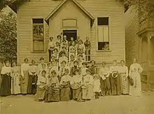 The first women's suffrage convention in the state was held on June 16 and 17 in 1870 at Mount Pleasant.[24] At the convention, organized by Joseph Dugdale, the Iowa Woman Suffrage Association (IWSA) was created with Henry O'Connor as president and Bloomer as vice president.[24][25] Four months later, a local suffrage group was formed by prominent women in Des Moines.[26] The women involved included Mary Darwin, Mattie Griffith, Nettie Sanford, and Annie Nowlin Savery.[27] During this time, the news attempted to cast the IWSA as a proponent of "free-love" and against marriage in order to discredit the movement.[28] On October 25, 1870, suffragists in Polk County also organized their own group.[29]