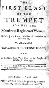 Title page of John Knox's The First Blast from a 1766 edition with modernised spelling