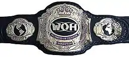 The belt design has black leather with a pink & purple back design of the leather. It has a pink & purple outlined crown at the top of the center plate with the logo WOH in the middle of the center plate. Also under the WOH sign of the original design of the title it has the word Women of Honor and under that it has the word champion both with pink & purple squared backgrounds behind the gold wordings closing the wordings in short squares also with gold center & side plates with pink & purple outlined roses & flowers indented in the title for a very feminine approach, with two sections of the world on its side plates (2-side plates, 1-center plate).[5]